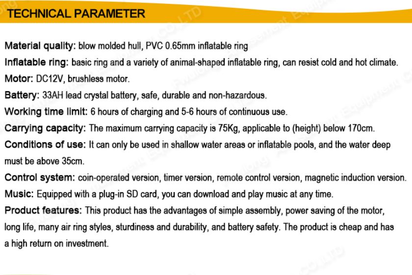 | Water Height | The depth of water must be up 35 centimeter. |